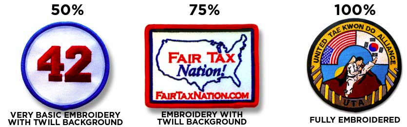 Embroidery coverage defines the amount of embroidery across the entire surface of a patch. We base our embroidery percentages upon 3 basic amounts: 50%, 75%, and 100%. Red and Black areas represent stitching, white areas represent mesh.