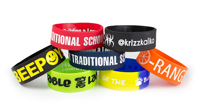 The process for all three styles is the exact way as the smaller wristbands. For more information on the types, please see the corresponding pages for the regular sized wristbands: Debossed Wristbands, Debossed Printed Wristbands, Silkscreened Wristbands.