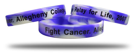 Silkscreen wristbands are produced by creation of a mold that resembles the shape of the wristband. One the mold is created, molten silicone in the color of your choice, whether a single color, segmented colors, swirled color combinations or "glow in the dark" color is poured into the mold and allowed to cure. Once cured, the wristband is removed from the mold, your text, logos and images are printed with environmentally safe, LEAD FREE paint that is guaranteed last. Once the Printing process is complete your custom Silkscreen wristbands are packaged for delivery